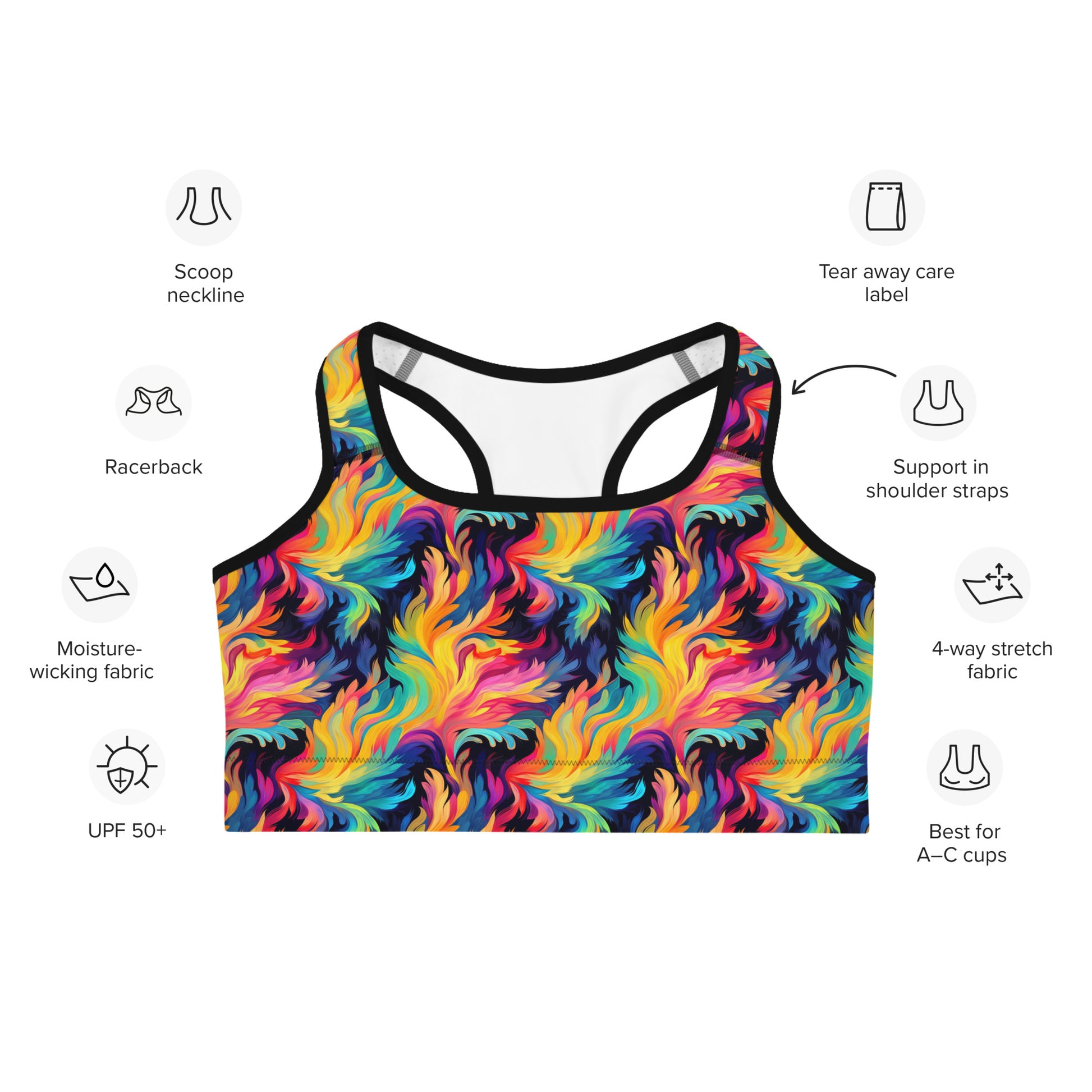 • Unterstützendes Material an den Schulterriemen, doppelte Stoffschicht vorne und breites Elastikband unter den Brüsten